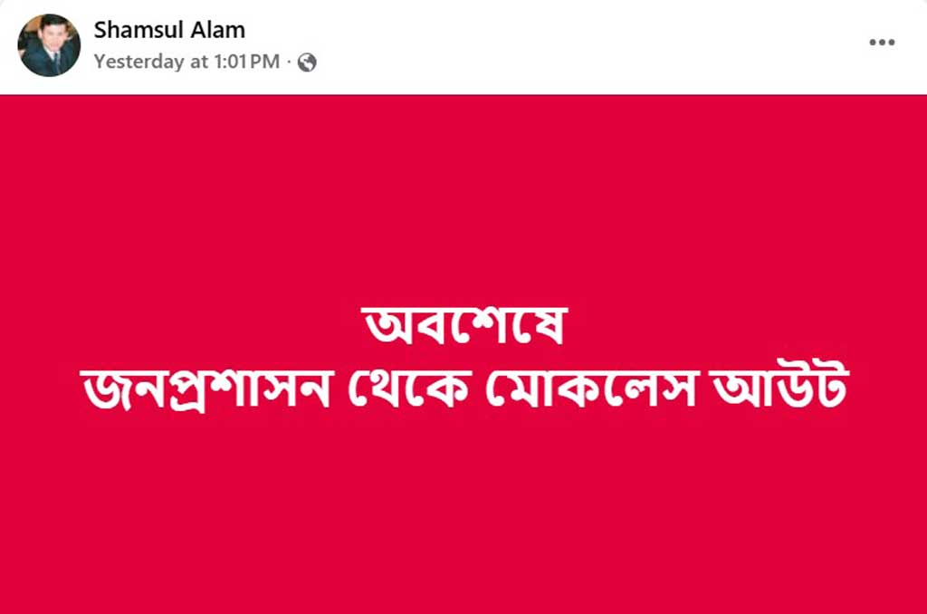 রোববার ফেইসবুকে আরেক পোস্টে শামসুল আলম লেখেন, “অবশেষে জনপ্রশাসন থেকে মোকলেস আউট।”