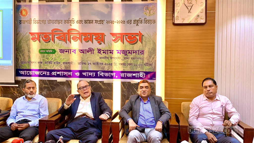 রাজশাহী ও রংপুর অঞ্চলকে দেশের খাদ্য ভাণ্ডার বলে খাদ্য ও ভূমি উপদেষ্টা আলী ইমাম মজুমদার বলেছেন, চলতি মৌসুমে আমনের ফলন ভালো হবে এবং নভেম্বরের মাঝামাঝি থেকে খাদ্য সংগ্রহ অভিযান শুরু হবে।
