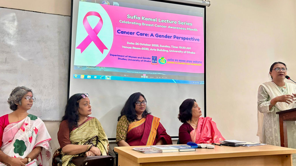 ব্রেস্ট ক্যান্সার সচেতনতা মাস উপলক্ষে বিশ্ববিদ্যালয়ের কলা ভবনে উইমেন অ্যান্ড জেন্ডার স্টাডিজ বিভাগ ও সেন্টার ফর ক্যান্সার কেয়ার ফাউন্ডেশন-সিসিসিএফ আয়োজিত ‘সুফিয়া কামাল লেকচার সিরিজ: ক্যান্সার কেয়ার-অ্যা জেন্ডার পার্সপেক্টিভ’ শীর্ষক এ আলোচনা সভা হয়।