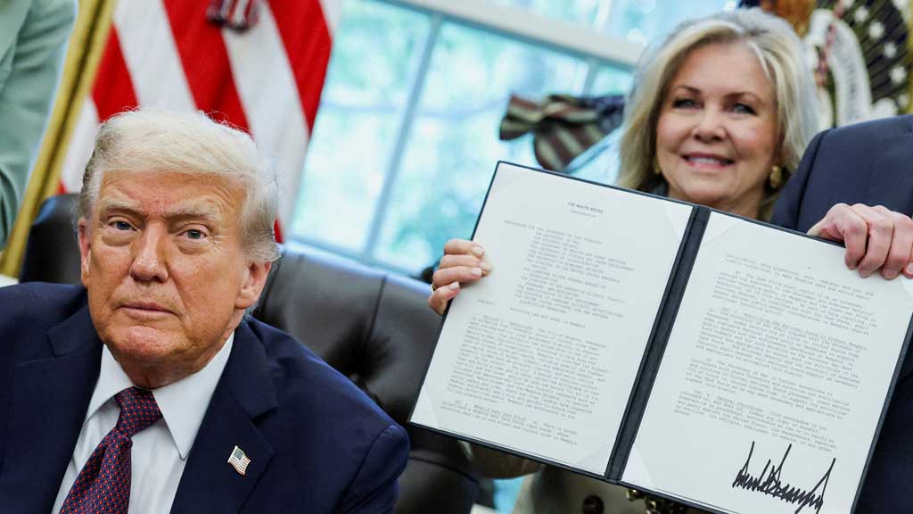 হোয়াইট হাউজে প্রেসিডেন্ট ডনাল্ড ট্রাম্পের সঙ্গে রিপাবলিকান সেনেটর মার্শা ব্ল্যাকবার্ন। ছবি: রয়টার্স