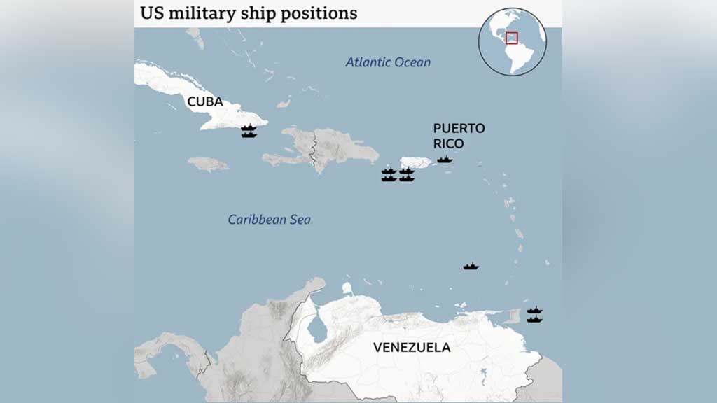 উপগ্রহ ও সমুদ্রে যান চলাচল সংক্রান্ত তথ্যের ওপর ভিত্তি করে ২৩ অক্টোবর ক্যারিবীয় অঞ্চলে মার্কিন যুদ্ধজাহাজগুলোর অবস্থান। ছবি: বিবিসি