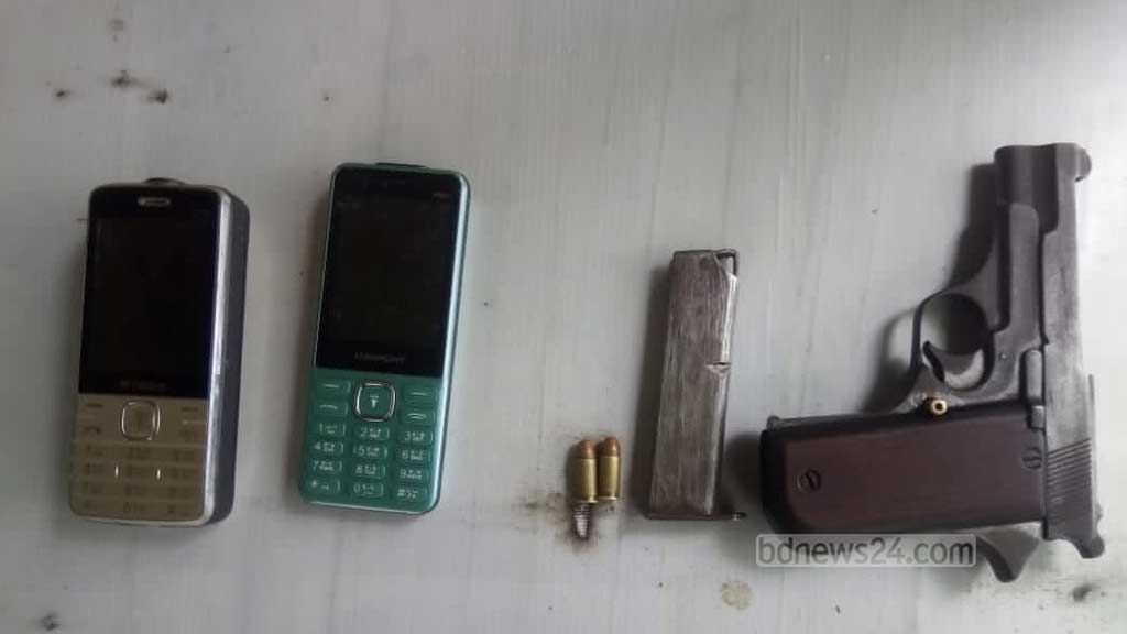 পরে তল্লাশি চালিয়ে একটি পিস্তল, ম্যাগজিন, দুই রাউন্ড এ্যামোনিশন, দুটি ওয়াকিটকি চার্জার, দুটি মোবাইল ফোন, ধারালো অস্ত্র এবং বেশ কিছু সরঞ্জাম উদ্ধার করা হয়।