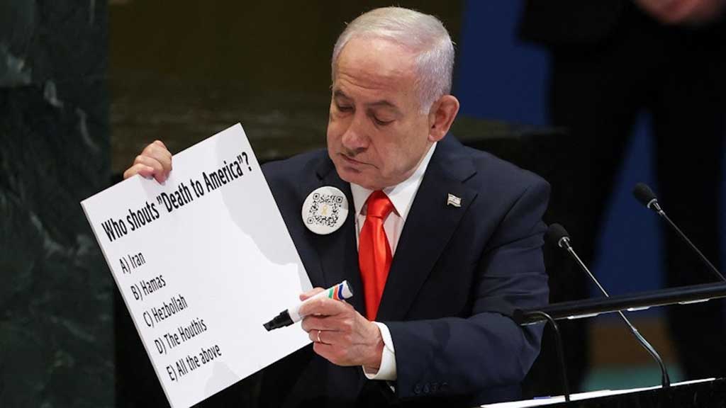 জাতিসংঘে প্ল্যাকার্ড হাতে বক্তব্য রাখছেন বেনিয়ামিন নেতানিয়াহু। ছবি: রয়টার্স