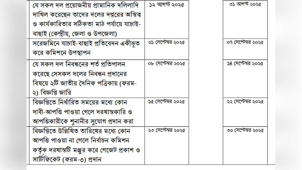 সব কিছু পর্যালোচনা করে যোগ্যদের বিষয়ে বিজ্ঞপ্তি প্রকাশ, দাবি-আপত্তি নিষ্পত্তি করে চলতি মাসে নতুন দল নিবন্ধনের কাজ চূড়ান্ত করার কথা রয়েছে নির্বাচন কমিশনের।