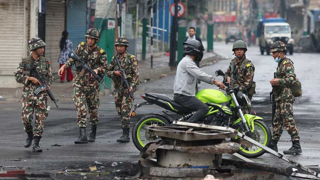 আইন-শৃঙ্খলা ফেরাতে রাজধানী কাঠমাণ্ডুর রাস্তায় রাস্তায় টহল দিচ্ছে সেনাবাহিনী। পরিস্থিতি দ্রুত স্বাভাবিক করার চেষ্টা চলছে।