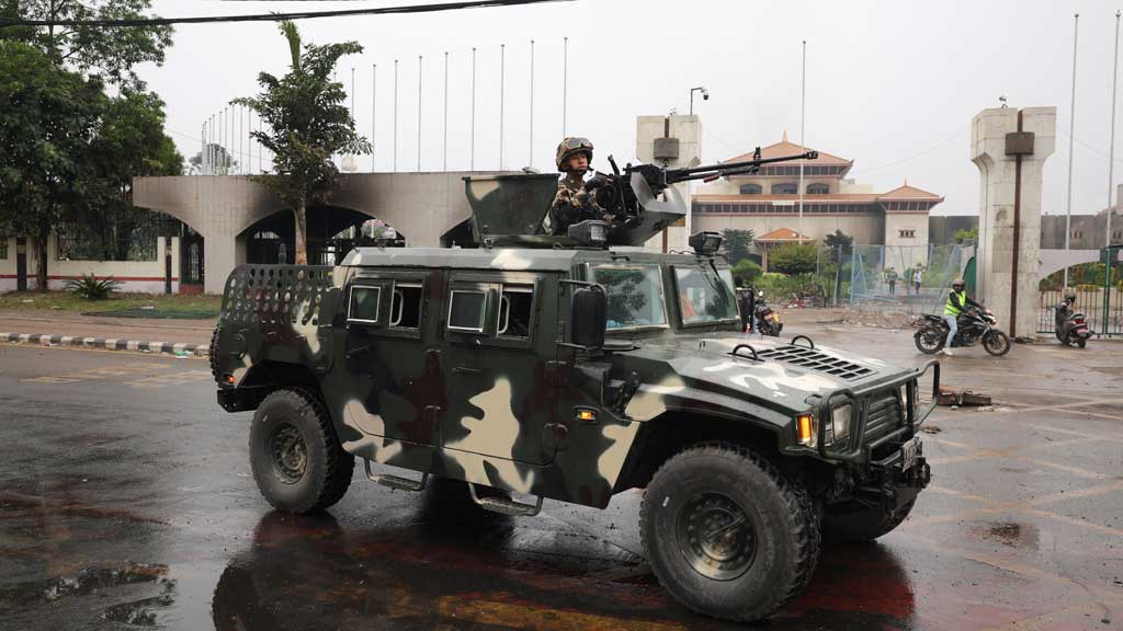 নেপালের পার্লামেন্ট হাউজের সামনের দিয়ে যাচ্ছে দেশটির সেনাবাহিনীর একটি সামরিক যান। ছবি: রয়টার্স