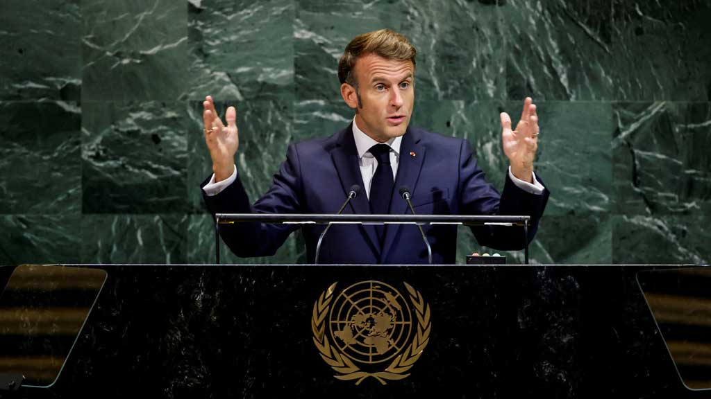নিউ ইয়র্কে জাতিসংঘের সদরদপ্তরে সাধারণ পরিষদের ৮০তম অধিবেশনে ভাষণ দিচ্ছেন ফ্রান্সের প্রেসিডেন্ট এমানুয়েল মাক্রোঁ। ছবি: রয়টার্স