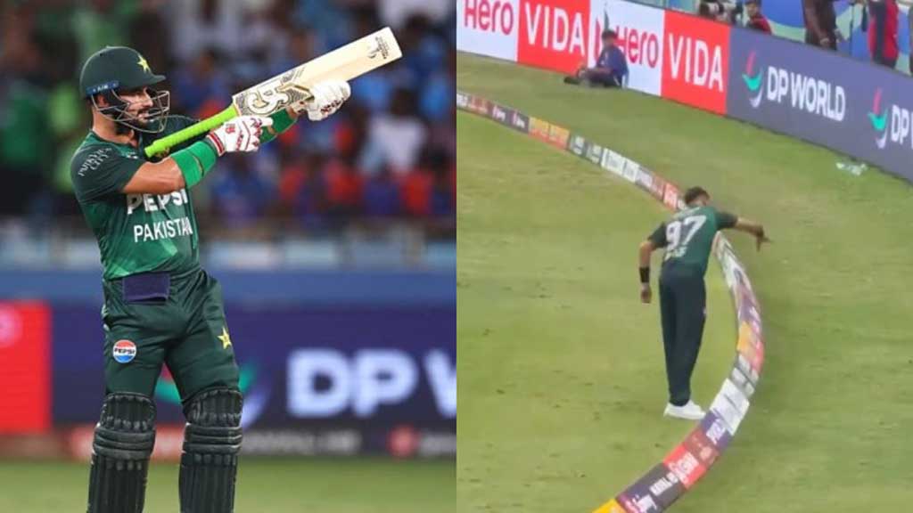 সাহিবাজাদা ফারহানের ব্যাটকে বন্দুক বানানো আর হারিস রউফের বিমান ভূপাতিত করার ভঙ্গি। ছবি: ভিডিও থেকে।