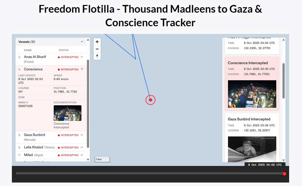 বুধবার বেলা সাড়ে ১০টার পর ফ্রিডম ফ্লোটিলা লাইভ ট্র্যাকারে মিশর উপকূলের কাছে ‘কনশানস’ জাহাজটির অবস্থান দেখানো হয় লাল বিন্দু দিয়ে। এর মানে হল, ইসরায়েলি বাহিনী জাহাজটির নিয়ন্ত্রণ নিয়েছে।