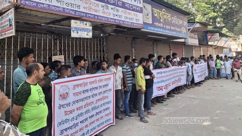 ব্রাহ্মণবাড়িয়া সরকারি মহিলা কলেজ মার্কেটের বরাদ্দকৃত বৈধ বাণিজ্যিক স্থাপনা অবৈধ বলে উচ্ছেদ সিদ্ধান্তের প্রতিবাদে জেলা শহরের সব ফার্মেসি অনির্দিষ্টকালের জন্য বন্ধ ঘোষণা করে ধর্মঘট পালন করছে ‘কেমিস্ট অ্যান্ড ড্রাগিস্ট সমিতি’।