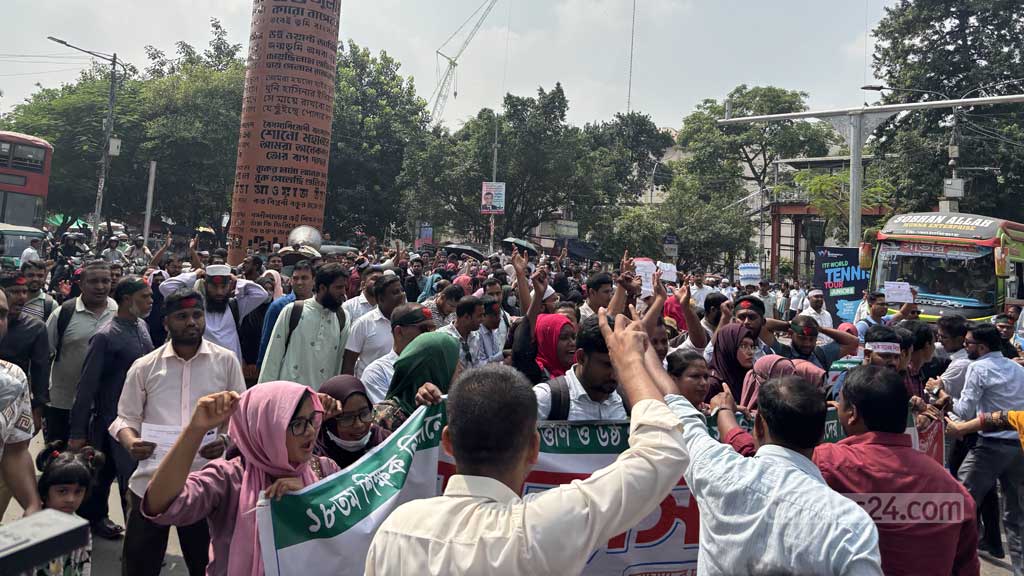 এ সময় ‘আমার সোনার বাংলায়, বৈষম্যের ঠাই নাই’, ‘দালালি না মেধা, মেধা, মেধা’, ‘থাকার কথা পাঠশালায়, আমরা কেন রাস্তায়’, তুমি কে আমি কে, সনদধারী, সনদধারী’–ইত্যাদি স্লোগান দিচ্ছিলেন আন্দোলনকারীরা।