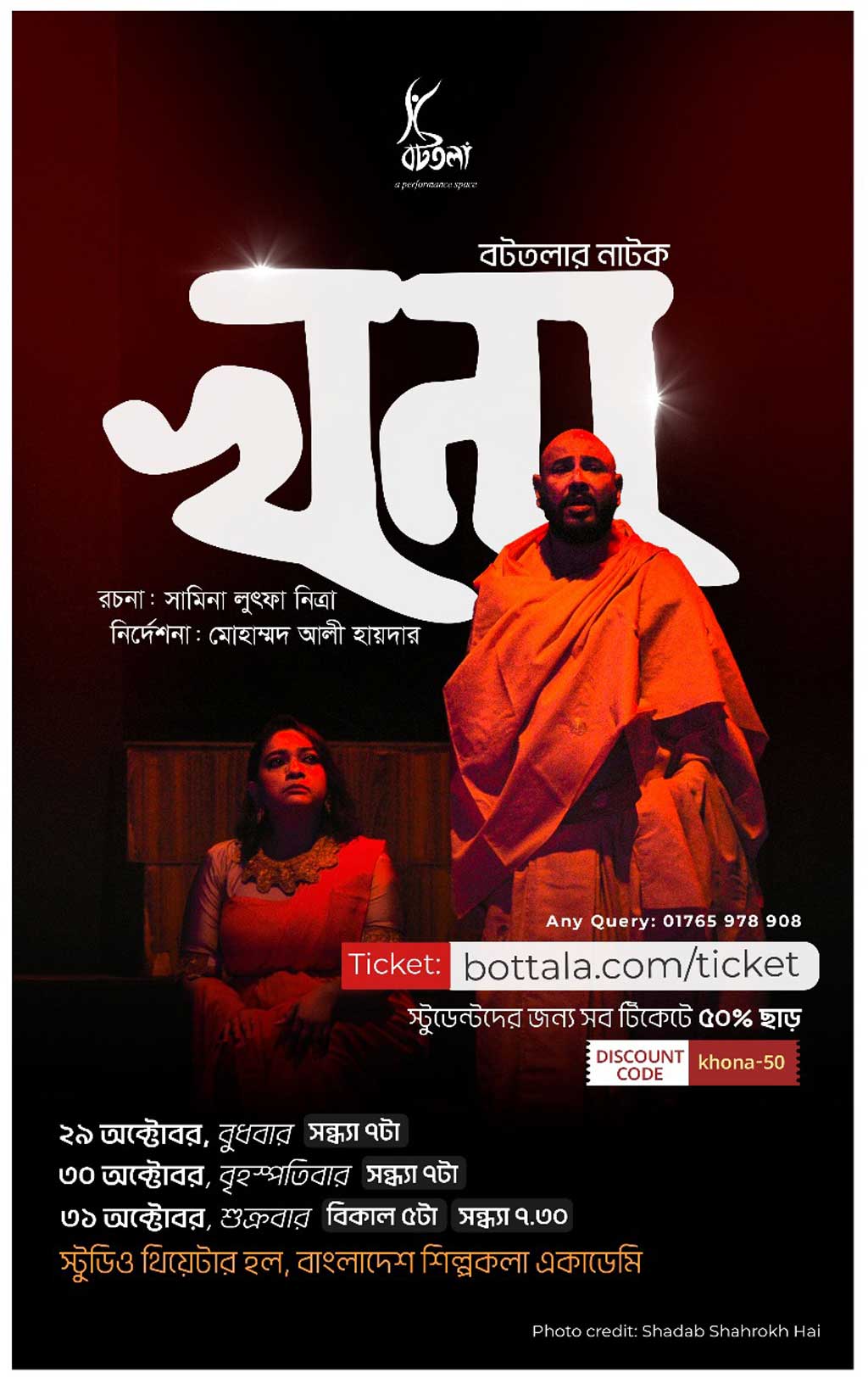বুধ ও বৃহস্পতিবার সন্ধ্যা ৭টায় এবং শুক্রবার বিকেল ৫টা এবং সন্ধ্যা সাড়ে ৭টায় আরও দুটি প্রদর্শনী হবে ‘খনার’। শিক্ষার্থীদের জন্য টিকেটে থাকছে ৫০ শতাংশ ছাড়।