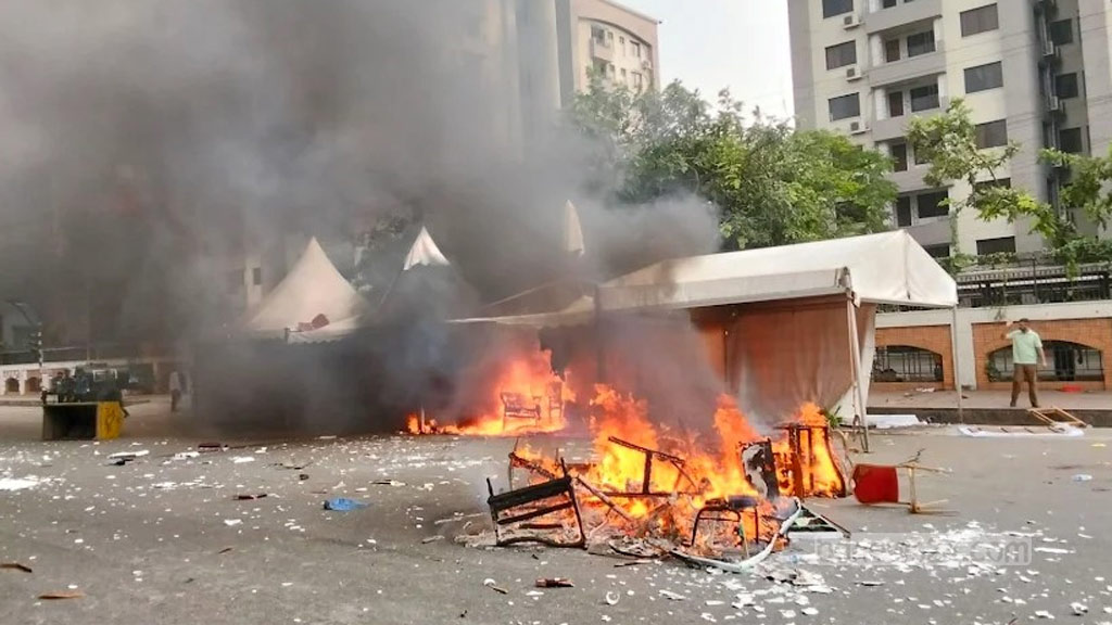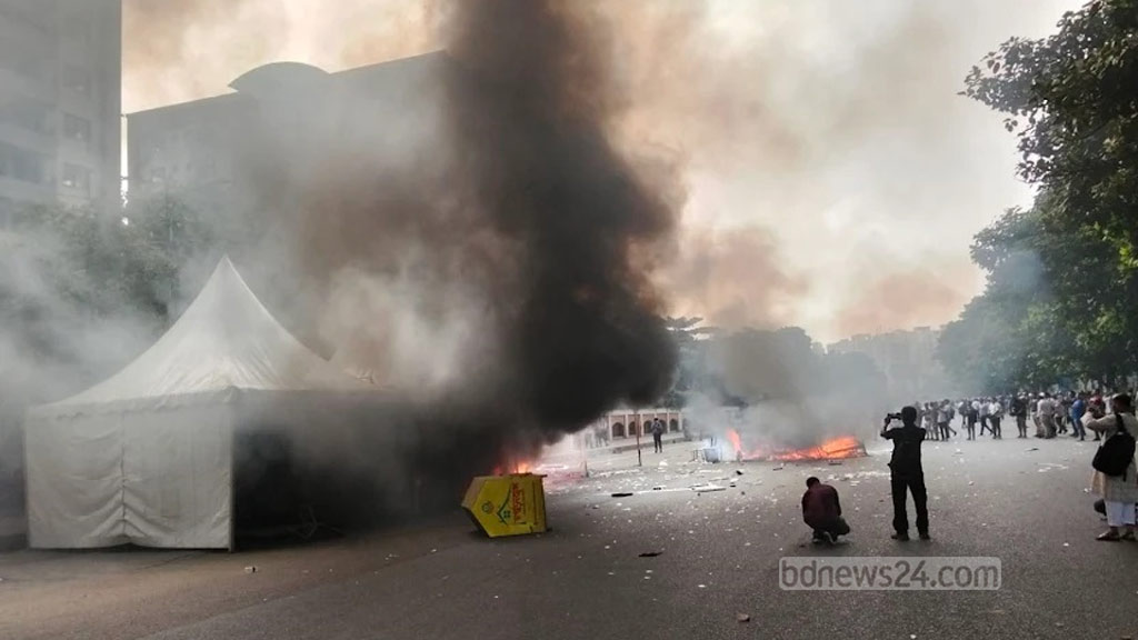 এ সময় ‘জুলাই যোদ্ধারা’ সংসদ ভবনের বাইরে কয়েকটি যানবাহন ভাঙচুর করে। সড়কে টায়ার ও কাঠ এবং অনুষ্ঠানের জন্য বাইরে বানানো ছোট ছোট তাঁবু একসঙ্গে করে তারা আগুন ধরিয়ে দেন।